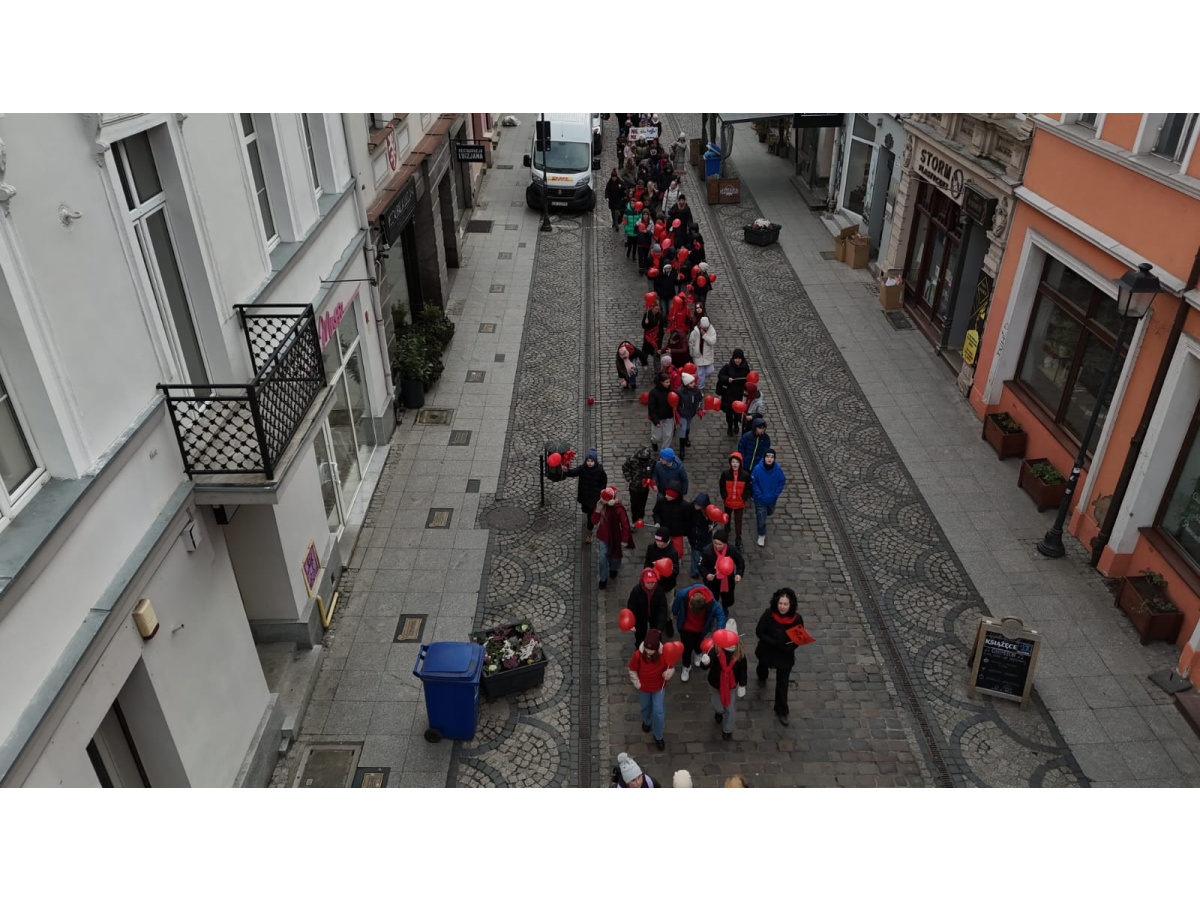 Punkt zbiórki znajdował się przy pomniku Kazimierza Wielkiego, patrona Bydgoszczy. Stamtąd uczestnicy wyruszyli ulicami Starego Miasta, niosąc transparenty, balony, papierowe serca i czerwone rączki — symbole solidarności i sprzeciwu wobec przemocy. Czerwień była motywem przewodnim wydarzenia: kolor ten pojawił się na balonach, szarfach, plakietkach. Każdy uczestnik otrzymał od organizatorów bransoletkę koloru czerwonego jako symbol włączenia się w akcję i poparcia założeń kampanii.