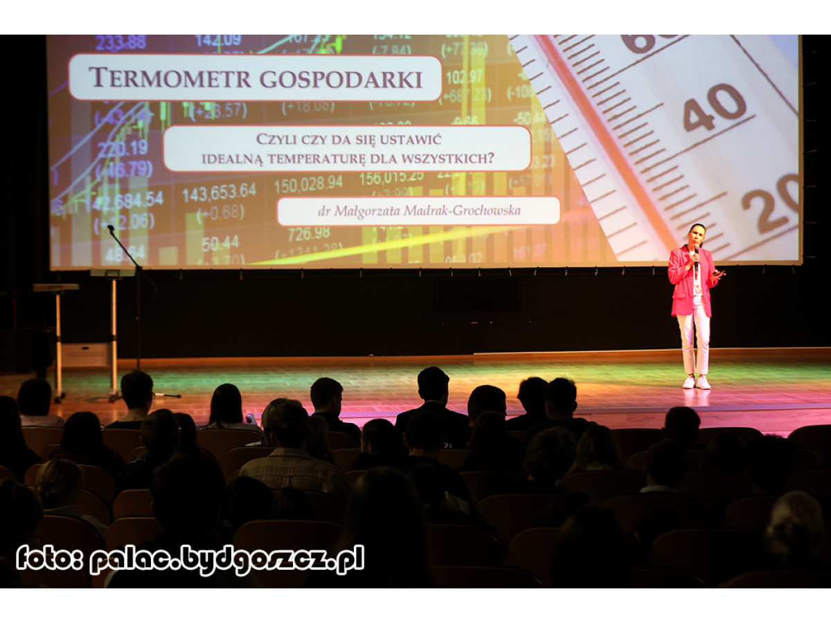 Pierwszą część konferencji stanowił wykład zaproszonego gościa – dr Małgorzaty Madrak-Grochowskiej, doktora nauk ekonomicznych, adiunkta w Katedrze Ekonomii i Marketingu na Wydziale Zarządzania Politechniki Bydgoskiej, nauczyciela akademickiego, trenera i konsultanta ekonomicznego. Pani doktor wygłosiła wykład pt. „TERMOMETR GOSPODARKI. Czyli czy da się ustawić idealną temperaturę dla wszystkich?”, w którym omówiła mechanizmy ekonomiczne wpływające na codzienne funkcjonowanie społeczeństw, przedstawiając liczne przykłady, które wzbudziły duże zainteresowanie młodzieży.