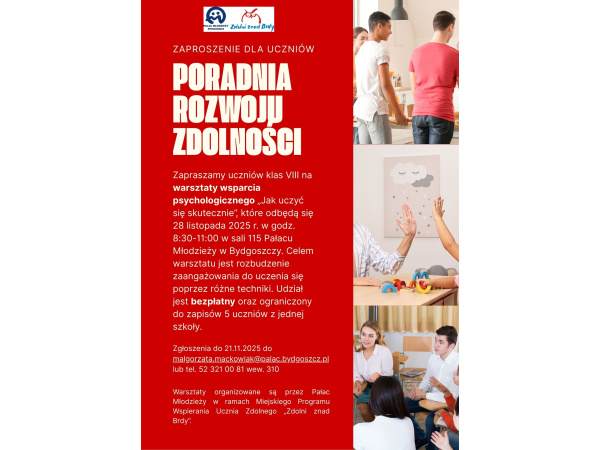 Spotkanie zatytułowane „Jak uczyć się skutecznie” odbędzie się 28 listopada 2025 r. (piątek) o godz. 8:30-11:00 w sali 115 bydgoskiego Pałacu Młodzieży. Celem warsztatu będzie rozbudzenie w młodzieży zaangażowania do uczenia się z wykorzystaniem różnych technik. Prowadzące - panie psycholog Sonia Szczurek i Magdalena Borowska z Poradni Psychologiczno-Pedagogicznej nr 1 w Bydgoszczy. Przewidywany czas spotkania - ok. 3 godziny dydaktyczne. Liczba miejsc ograniczona. Decyduje kolejność zgłoszeń. Z jednej szkoły można zapisać maksymalnie 5 najzdolniejszych uczniów. Udział w warsztatach jest bezpłatny. Zgłoszenia prosimy kierować do 21.11.2025 do koordynatora programu „Zdolni znad Brdy” – Małgorzaty Maćkowiak, e-mail: malgorzata.mackowiak@palac.bydgoszcz.pl lub tel. 52 321 00 81 wew. 310. Warsztaty organizowane są przez Pałac Młodzieży w ramach Miejskiego Programu Wspierania Ucznia Zdolnego „Zdolni znad Brdy”.