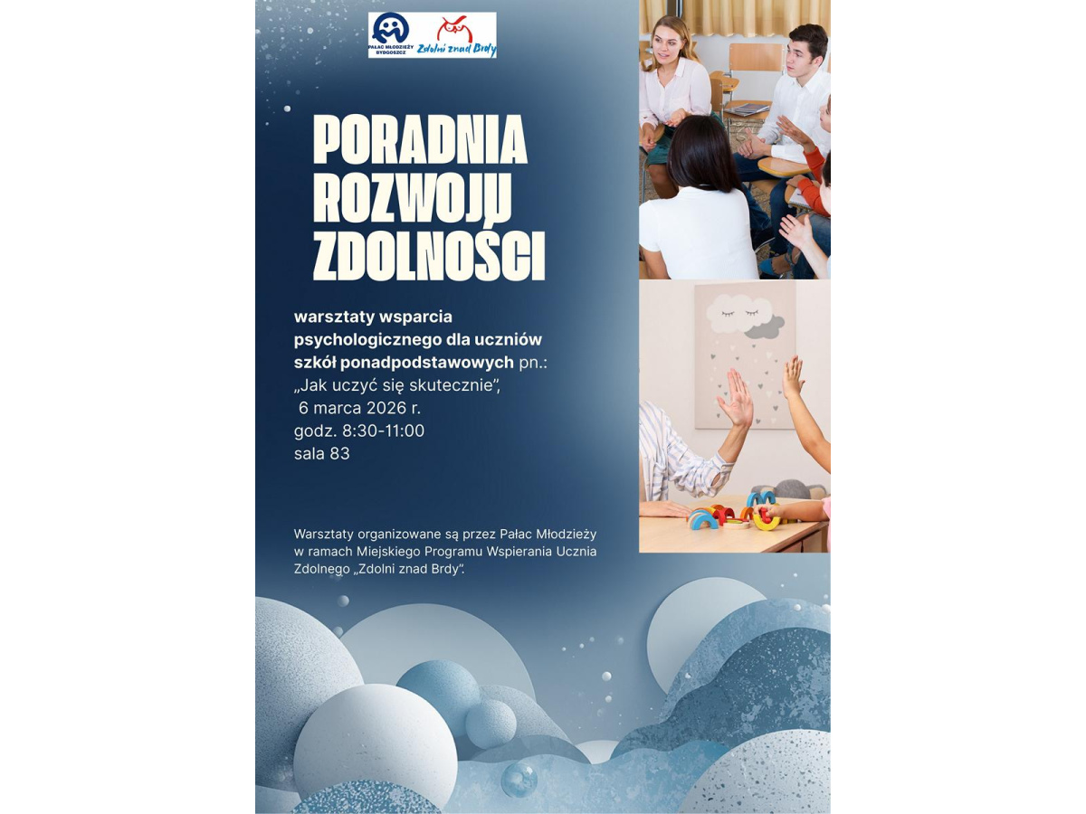 Spotkanie zatytułowane „Jak uczyć się skutecznie” odbędzie się 6 marca 2026 r. (piątek) w godz. 8:30-11:00 w sali 83 bydgoskiego Pałacu Młodzieży. Celem warsztatu będzie rozbudzenie w młodzieży zaangażowania do uczenia się z wykorzystaniem różnych technik. Prowadzące - panie psycholog Sonia Szczurek i Magdalena Borowska z Poradni Psychologiczno-Pedagogicznej nr 1 w Bydgoszczy.