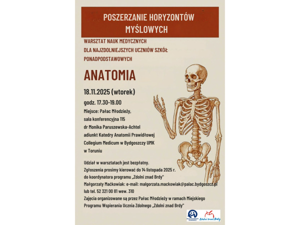 Spotkanie poprowadzi dr Monika Paruszewska-Achtel, adiunkt Katedry Anatomii Prawidłowej Collegium Medicum w Bydgoszczy UMK w Toruniu. Udział w warsztatach jest bezpłatny. Zgłoszenia prosimy kierować do 14 listopada 2025 r. do koordynatora programu „Zdolni znad Brdy” – Małgorzaty Maćkowiak: e-mail: malgorzata.mackowiak@palac.bydgoszcz.pl lub tel. 52 321 00 81 wew. 310. Zajęcia organizowane są przez Pałac Młodzieży w ramach Miejskiego Programu Wspierania Ucznia Zdolnego „Zdolni znad Brdy”.