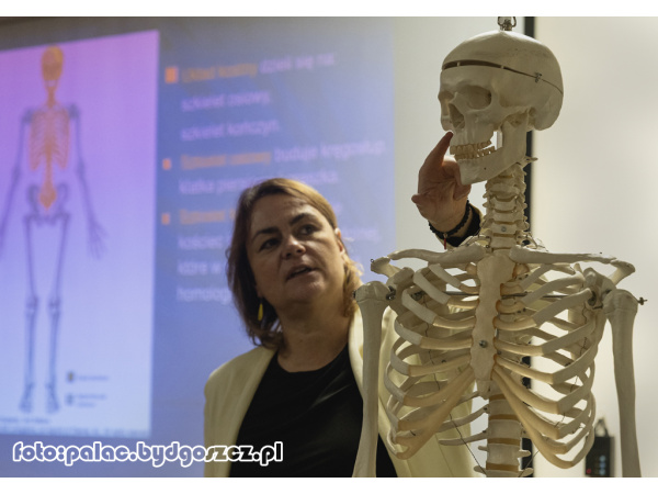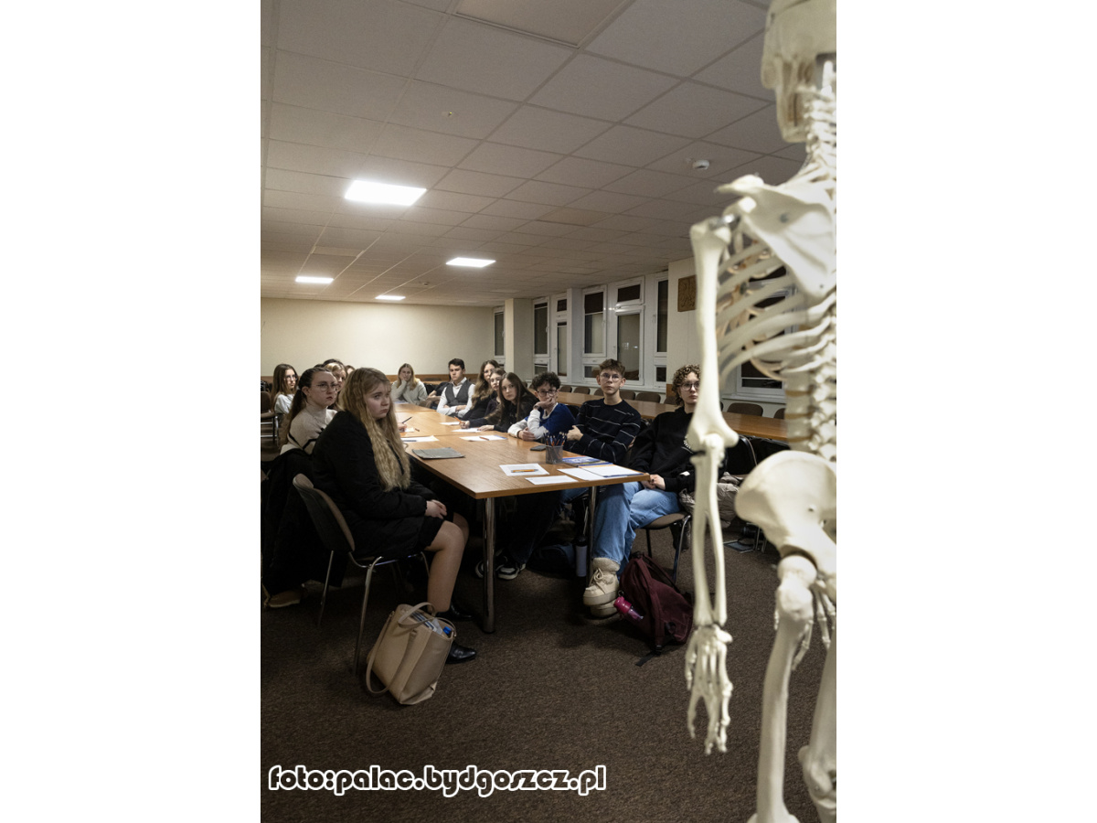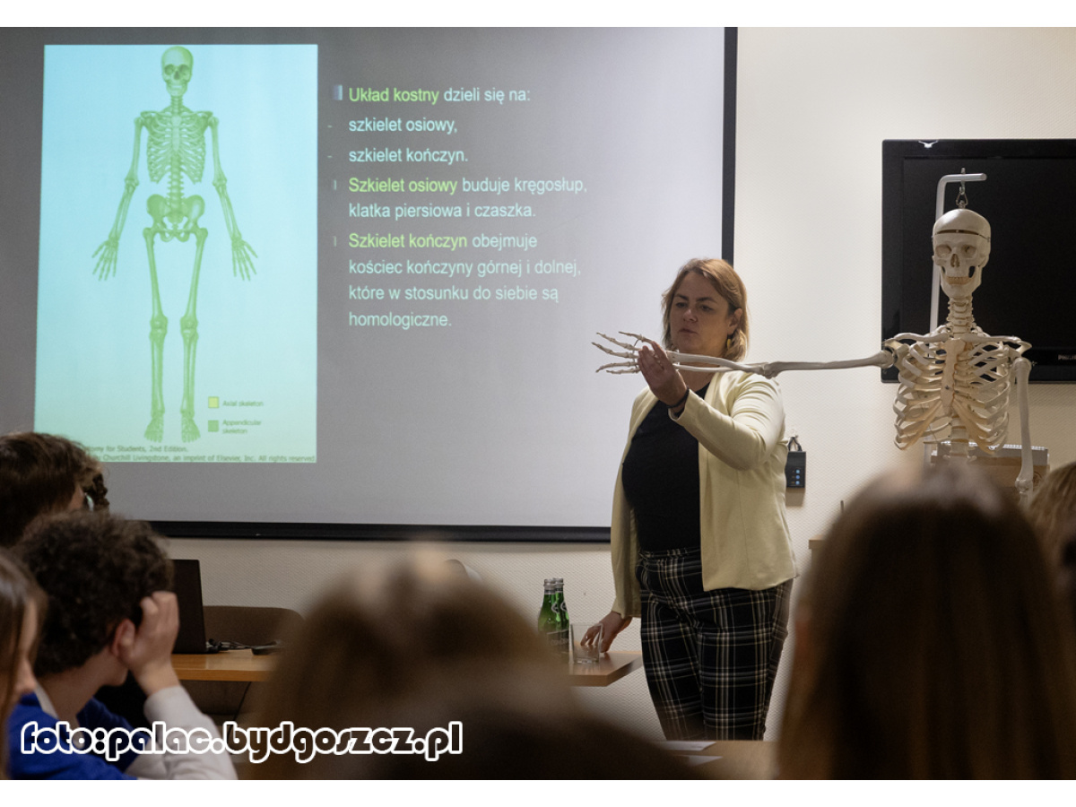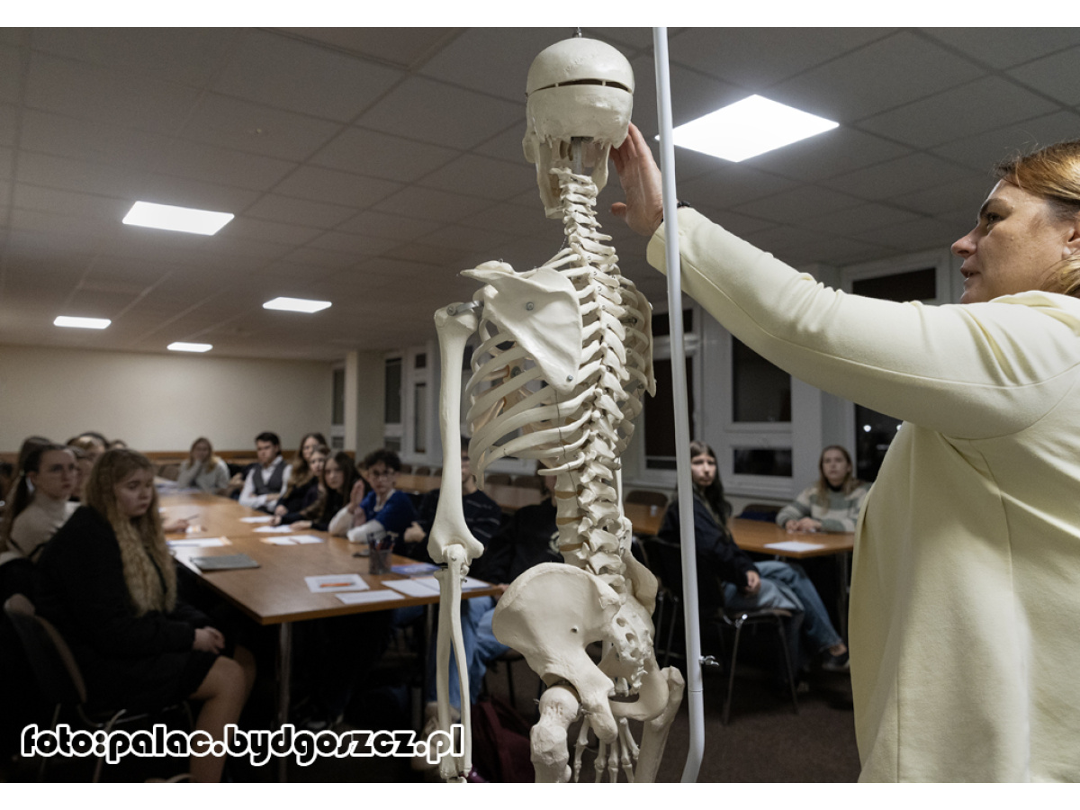 Warsztaty poprowadziła dr Monika Paruszewska-Achtel – adiunkt Katedry Anatomii Prawidłowej Collegium Medicum w Bydgoszczy UMK w Toruniu. W przystępny i inspirujący sposób Pani doktor przedstawiła młodzieży anatomię człowieka, omawiając m.in. budowę kości i stawów, mechanikę ruchu oraz wzajemne powiązania struktur układu kostnego i mięśniowego. Uczestnicy mogli oglądać przykłady na szkielecie, analizować jego budowę i zadawać pytania dotyczące funkcjonowania poszczególnych elementów układu ruchu.