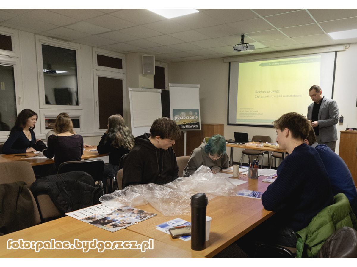 18 listopada 2025 roku w Pałacu Młodzieży, w sali konferencyjnej 115, odbyły się warsztaty projektowe pt. „Od potrzeby do produktu – inżynieria w medycynie”, zorganizowane w ramach cyklu „Poszerzanie Horyzontów Myślowych”.