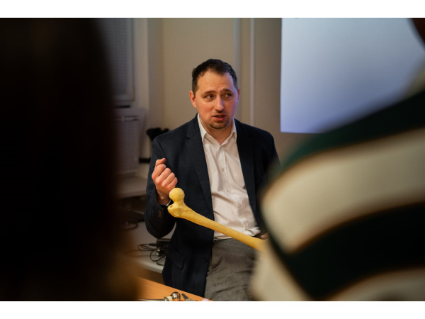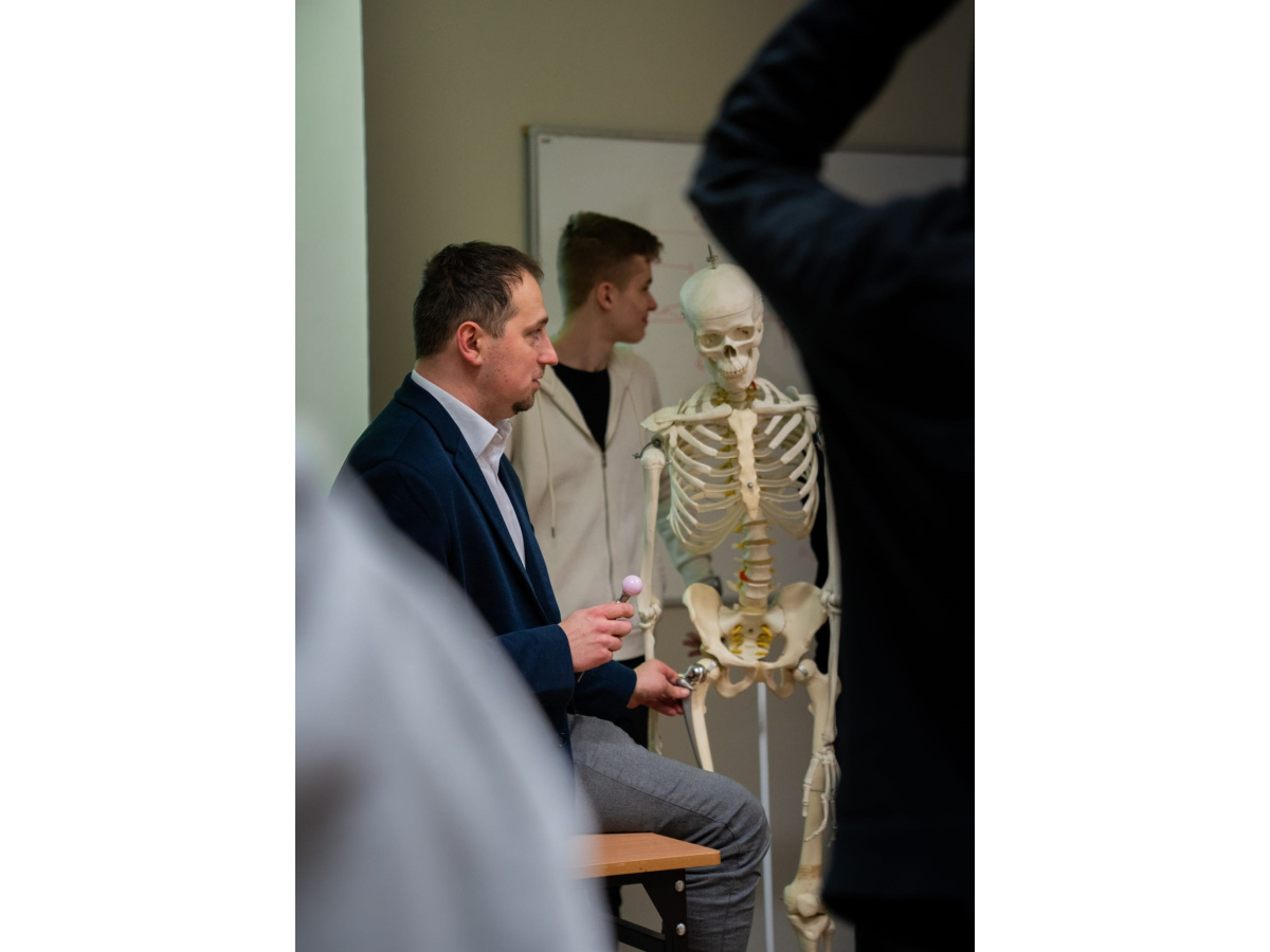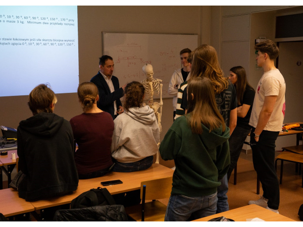 Na zajęciach uczniowie poznali sposób patrzenia inżynierów na ciało człowieka oraz dowiedzieli się, jak prawa dynamiki Newtona można odnieść do układu ruchu. Zaprezentowano metodę obliczania siły mięśni potrzebnych do uniesienia ciężaru własnych segmentów ciała oraz ciężarów przenoszonych w dłoniach. Uczniowie mogli na praktycznym przykładzie zaobserwować i zrozumieć zasadę działania dźwigni w kontekście inżynierskim i biomedycznym. W tym celu przedstawiono podstawy anatomii z zakresu przyczepów mięśniowych i budowy szkieletu człowieka. Zdobyte umiejętności pozwoliły na przeprowadzenie doświadczenia laboratoryjnego i na podstawie uzyskanych danych obliczenie miejsca położenia środków ciężkości ciał uczestników. Dodatkowo przeprowadzono eksperymenty związane z pomiarem bioimpedancji ciała, czyli jego oporności elektrycznej. Podsumowaniem tego eksperymentu było poznanie zasady działania i pomiar składu ciała na analizatorze BIA. Omówiono podstawowe parametry, które mogą świadczyć o stanie zdrowia organizmu, takie jak: zawartość wody wewnątrz i zewnątrzkomórkowej, beztłuszczowa masa ciała, wskaźnik BMI. Ostatnim punktem zajęć było przedstawienie w jaki sposób nowoczesna ortopedia odpowiada na zużycie powierzchni stawowych w naszym organizmie oraz jak leczy się trudne złamania. Uczniowie mogli oglądać i dotknąć prawdziwych endoprotez oraz zespoleń kostnych typu gwoździe śródszpikowe oraz płytki i śruby.