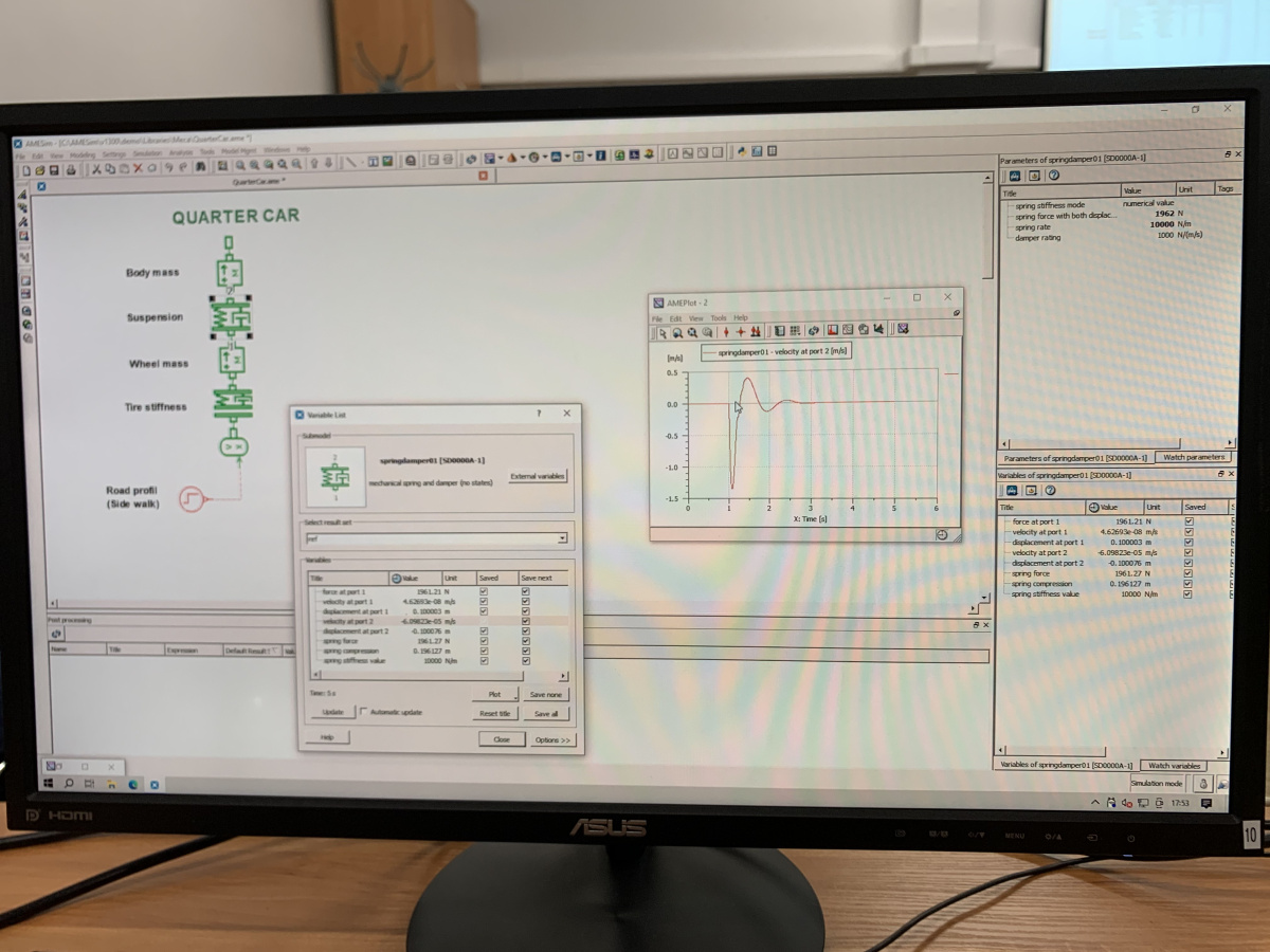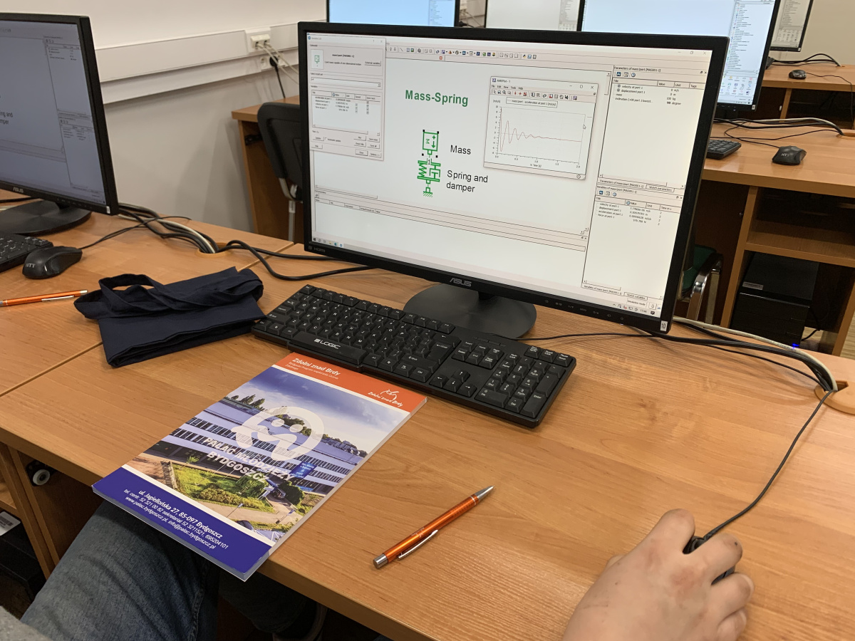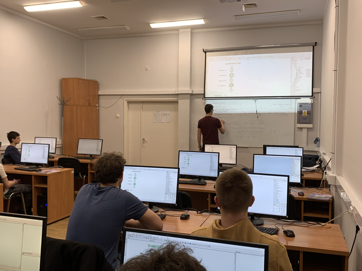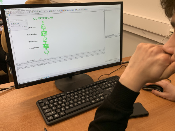 Tematem spotkania były podstawowe zagadnienia obliczeń inżynierskich w motoryzacji, ze szczególnym uwzględnieniem modelowania i analizy dynamiki zawieszenia pojazdu. Pod kierunkiem dr inż. Michała Lissa uczestnicy zapoznali się z praktycznym zastosowaniem metod rachunku inżynierskiego w opisie zjawisk mechanicznych występujących w pojazdach samochodowych. W trakcie zajęć uczniowie stworzyli i analizowali model ćwiartki zawieszenia pojazdu oraz poznali, jak odwzorować w postaci modelu rzeczywiste zawieszenie pojazdu i znaczenie poszczególnych elementów, takich jak masa resorowana, masa nieresorowana, sprężyna i amortyzator. Następnie wspólnie zapisali kilka równań ruchu układu (stosując kilka zagadnień z fizyki ogólnej) oraz omówili ich interpretację fizyczną w kontekście pracy zawieszenia samochodu. W części praktycznej przeprowadzili symulację modelu, obserwując wpływ parametrów na drgania nadwozia i koła. Zajęcia zakończyły się analizą wyników oraz dyskusją dotyczącą wpływu sztywności i tłumienia na komfort jazdy i stabilność pojazdu.