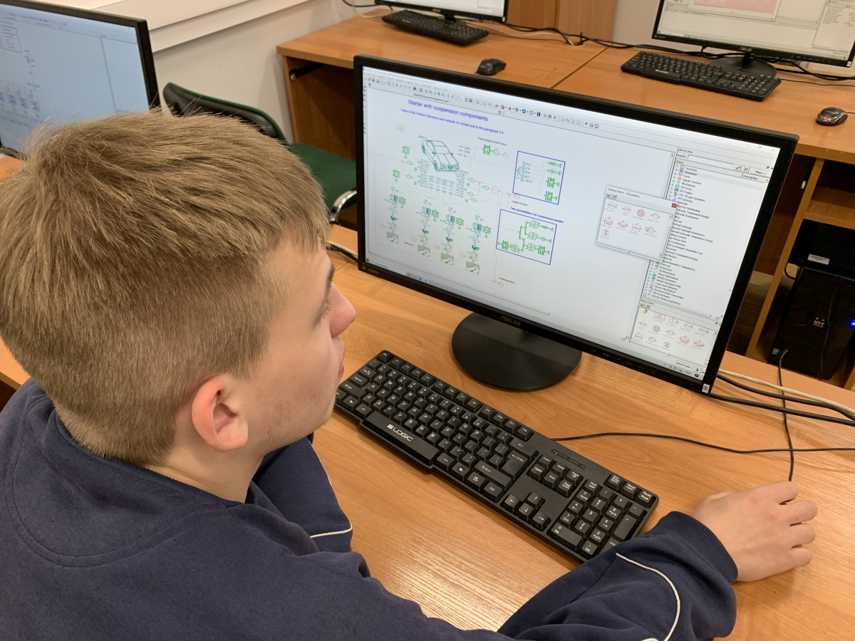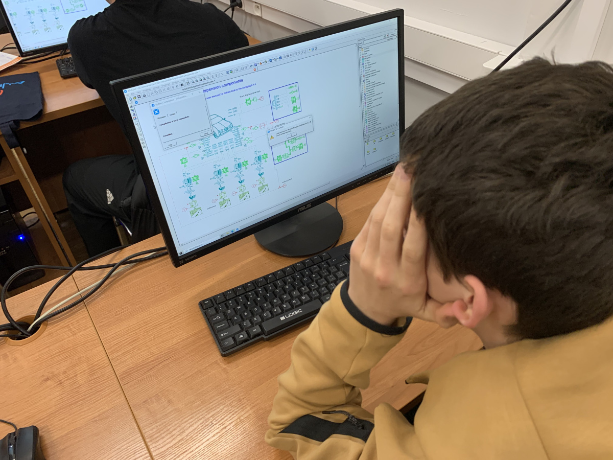 Uczniowie podczas piątych zajęć zajmowali się analizą dynamiczną kompletnego pojazdu w odniesieniu do profilu drogi, ze szczególnym uwzględnieniem pracy układu zawieszenia. W pierwszej części spotkania przeprowadzono obliczenia teoretyczne dotyczące parametrów zawieszenia, takich jak sztywność, tłumienie oraz wpływ tych wielkości na zachowanie pojazdu podczas przejazdu po nierównościach. Następnie na wcześniej przygotowanym przeze mnie modelu symulacyjnym, wprowadzali własne wartości parametrów uzyskane w wyniku obliczeń. W dalszej części zajęć skoncentrowano się na analizie wyników symulacji, zwracając uwagę na różnice w odpowiedzi układu wynikające z przyjętych parametrów oraz ogólnych możliwościach porównywania różnych wykresów z różnych fragmentów całego układu. Uczniowie mogli zaobserwować, jak zmiana właściwości zawieszenia wpływa na komfort jazdy oraz stabilność pojazdu. Zajęcia miały na celu pokazanie szerokich możliwości narzędzi symulacyjnych w odwzorowywaniu rzeczywistych zjawisk występujących w pojazdach zarówno mikro-, jak i makroskali. Warsztaty stanowiły również podsumowanie całego cyklu, ukazując przejście od prostych modeli do analizy złożonych układów inżynierskich.