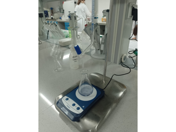 W trakcie ćwiczeń laboratoryjnych uczniowie oznaczali twardość ogólną wody, wynikającą z obecności rozpuszczonych soli wapnia i magnezu. Do analizy wykorzystywano próbki wody przyniesione przez uczestników zajęć, m.in. z domów lub szkół, co pozwoliło na bezpośrednie odniesienie wyników do codziennych doświadczeń związanych z jakością wody użytkowej. Otrzymane wyniki zostały przeliczone na stopnie niemieckie twardości wody [°n], a następnie porównane ze skalą twardości wody, dzięki czemu uczniowie mogli określić stopień twardości badanych próbek. Podczas zajęć uczestnicy pracowali zarówno na tradycyjnych biuretach szklanych, jak i zapoznali się z nowocześniejszym sprzętem laboratoryjnym – biuretami automatycznymi wyposażonymi w pompkę i mechanizm samoczynnego zerowania oraz biuretami cyfrowymi umożliwiającymi precyzyjne dozowanie i dokładny odczyt objętości.
