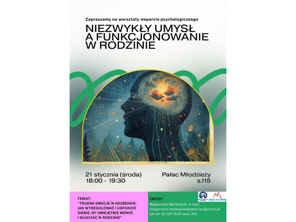 Temat: „Trudne emocje w rozmowie - jak wyregulować i uspokoić siebie, by umiejętnie mówić i słuchać w rodzinie”. Termin: 21 stycznia 2026 r. (środa). Godzina: 18:00–19:30. Miejsce: sala 115, Pałac Młodzieży w Bydgoszczy