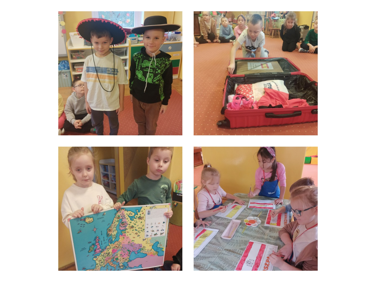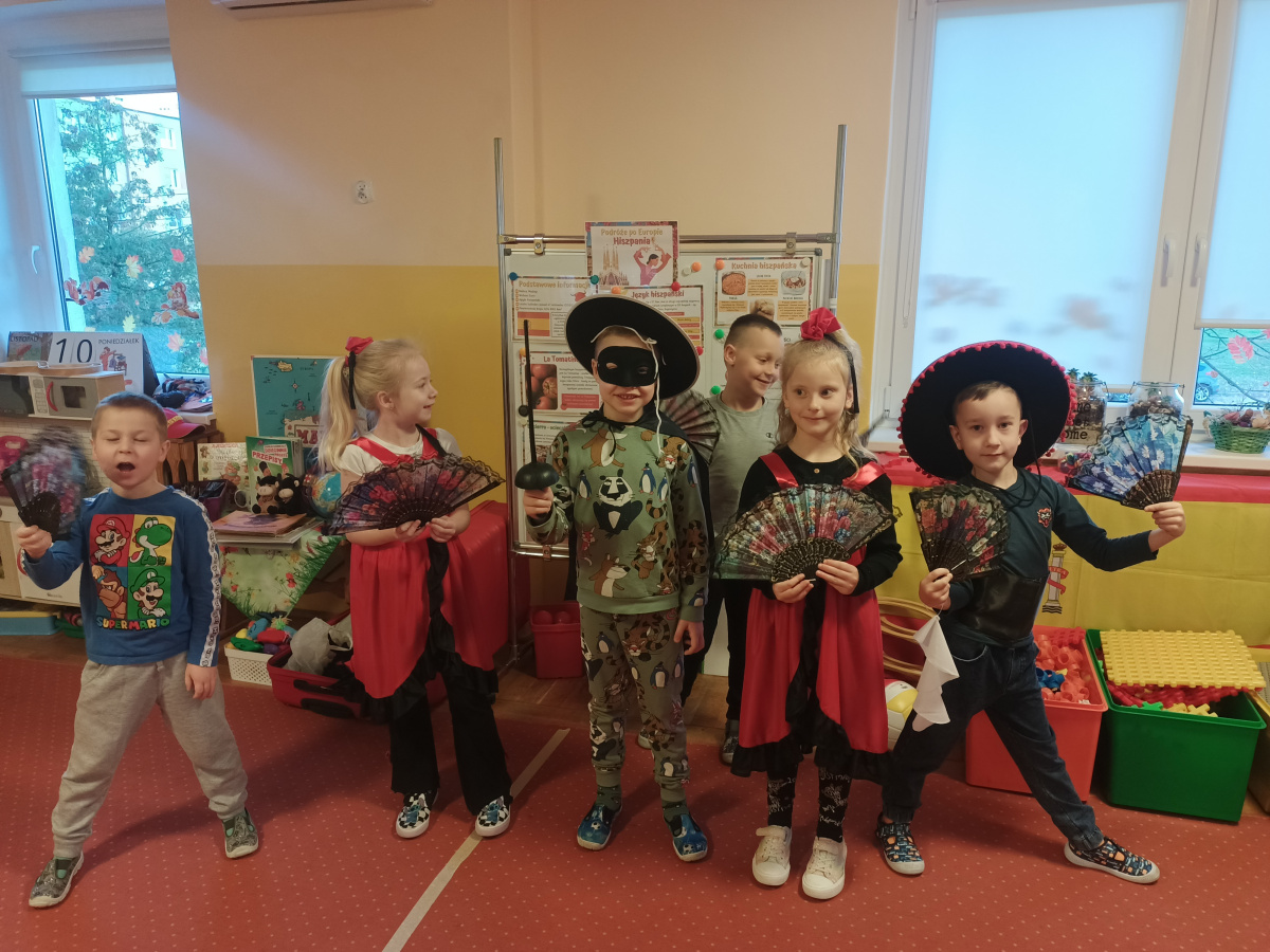 Dzieci poznały Hiszpanię, jej położenie na mapie Europy, poznały symbole narodowe, stolicę, zabytki, architekturę, tradycje, lokalne zwyczaje np. ,,la tomatina" i zabawy lokalne np.,, zik, zak, zuk " czy gra w chusteczkę oraz wybrane słowa w języku hiszpańskim. Poznały twórczość malarza Pablo Picasso przedstawiciela nurtu zwanego kubizmem. Tworzyły własne prace zainspirowane twórczością Picasso. Poznały literacką postać byczka Fernando ,który jest symbolem indywidualizmu i akceptacji siebie oraz pokoju, postać, która podkreśla, że warto pielęgnować w sobie spokój, nie poddawać się presji otoczenia w dążeniu do agresji i doceniać proste radości życia, zamiast spełniać cudze oczekiwania, uczy również tolerancji i szacunku dla odmienności oraz tego, że prawdziwa siła tkwi w łagodności i nieagresywności. Obejrzały film animowany Zorro i poznały legendarną postać obrońcy ludzi biednych i pokrzywdzonych.