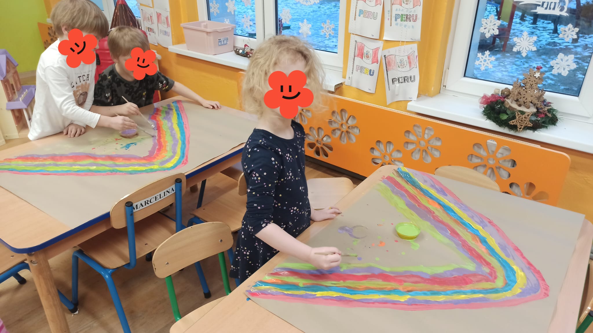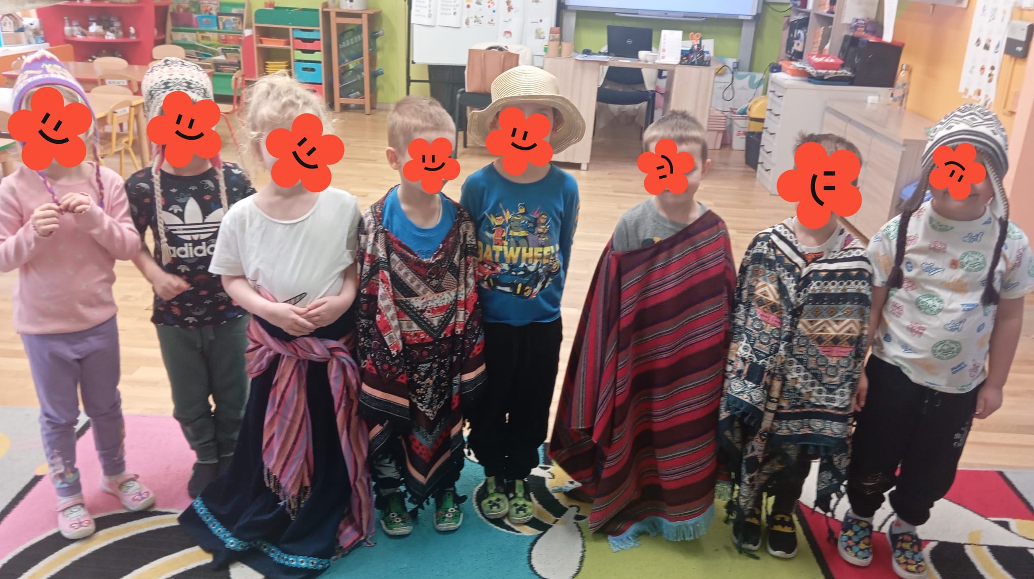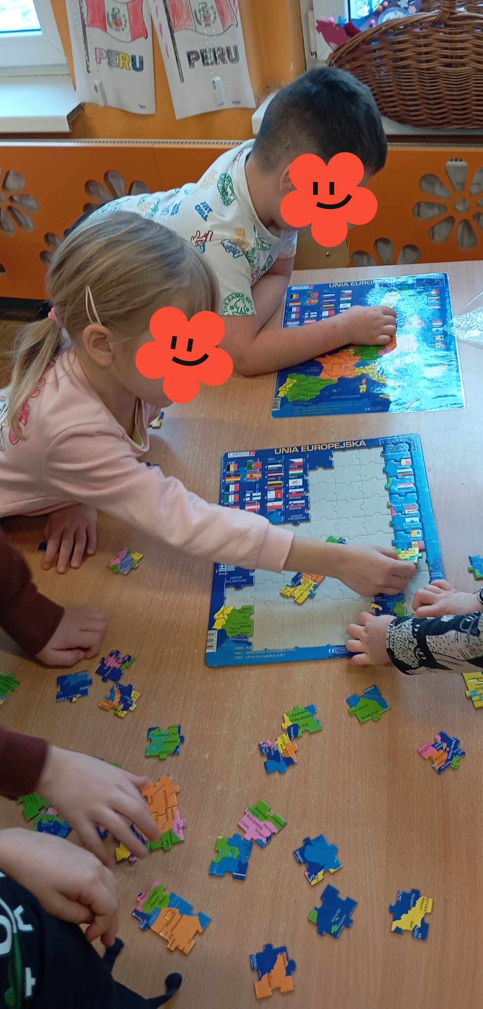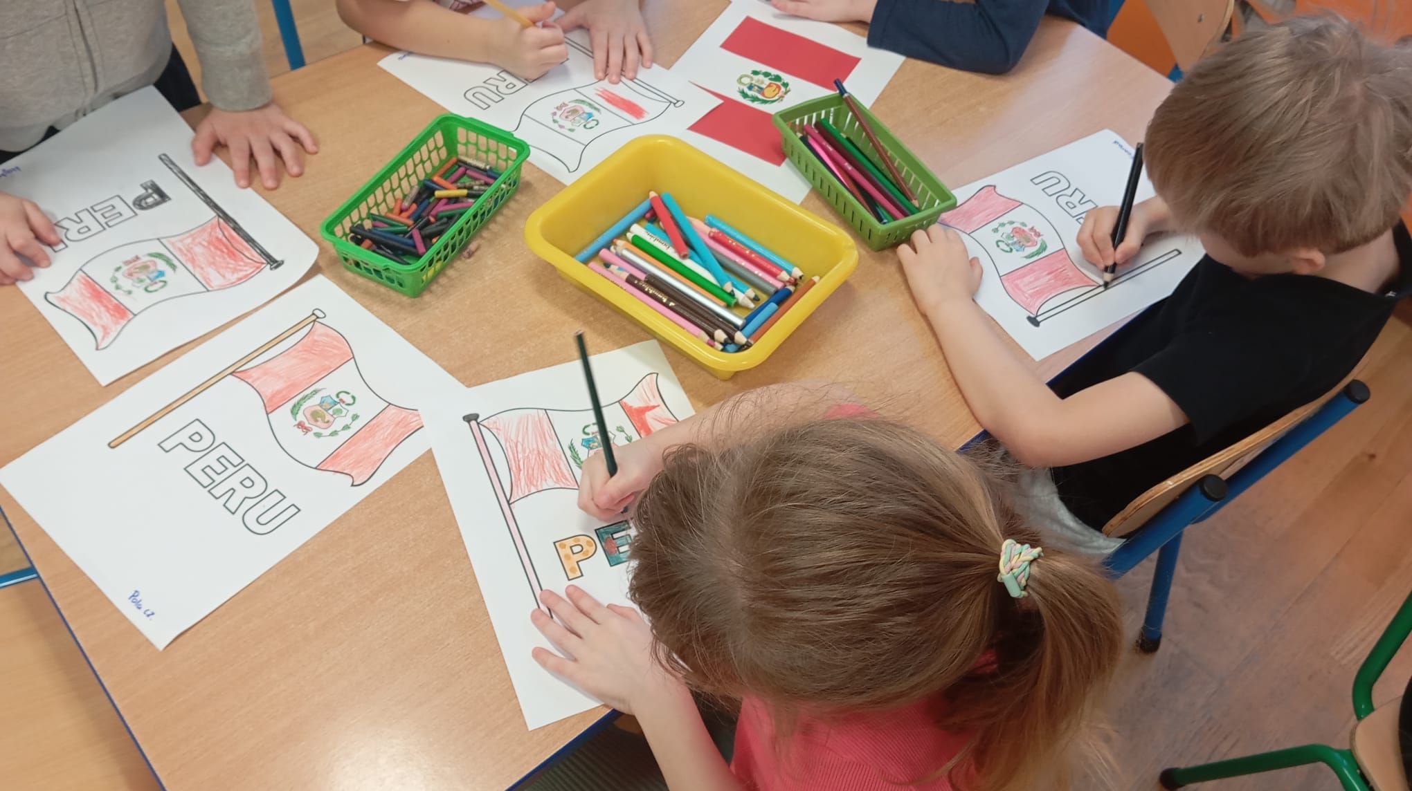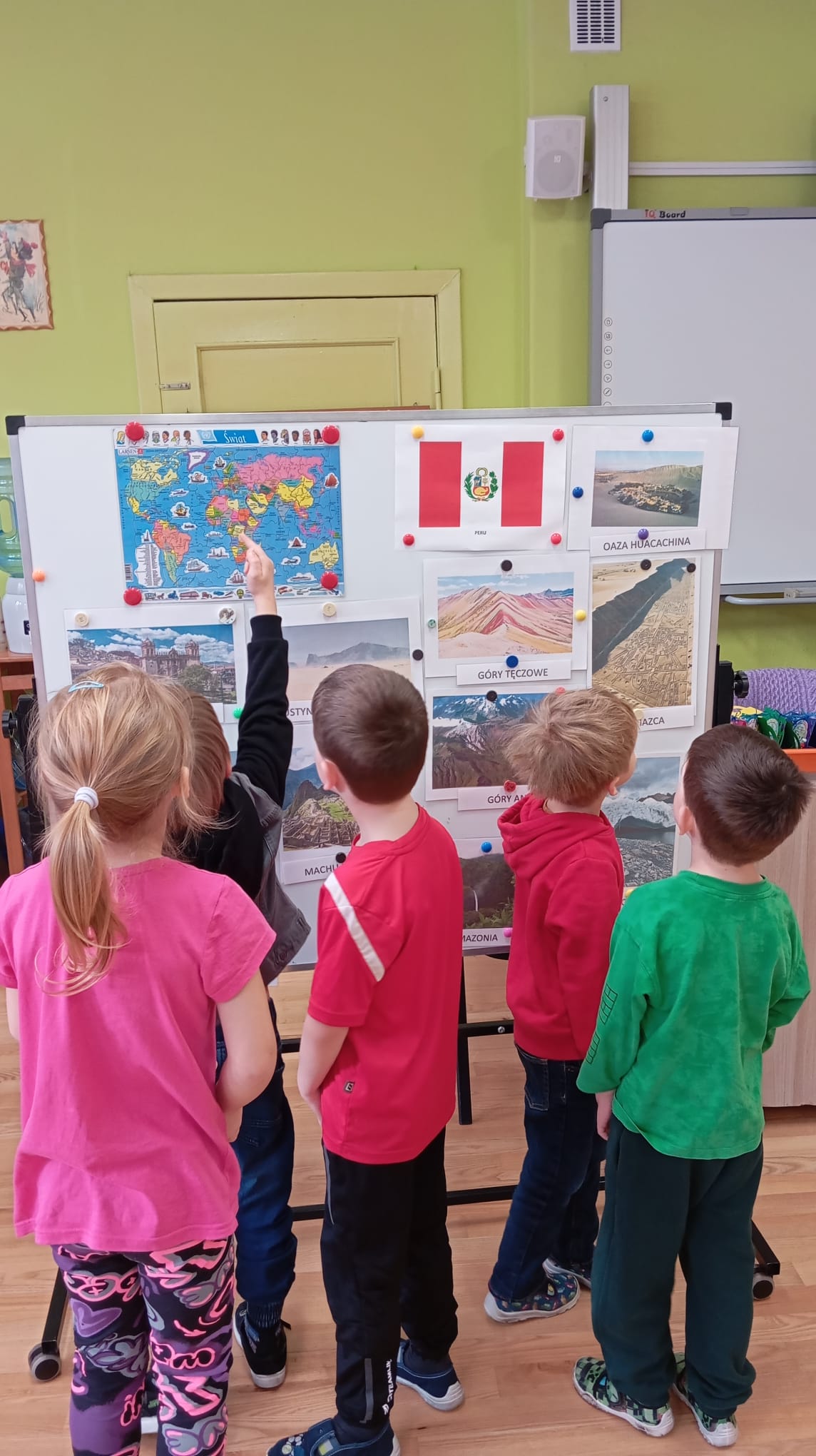 Wybraliśmy się również lecąc samolotem (Pedagogika zabawy) do Peru , kraju pełnego tajemnic, ciekawej architektury oraz niezwykłej przyrody. Każdy z nas i duży ( nauczyciel) i mały (przedszkolaki) coś przywiózł z tej dalekiej podróży. Wędrowaliśmy w towarzystwie alpaki Anty, która jest jednym z elementów umieszczonym na fladze Peru. Dotykaliśmy prawdziwej wełny z alpaki. Każdy kolorował flagę, znając poszczególne symbole i ich znaczenie. Układaliśmy puzzle z Mapą Świata , Europy oraz Polski. Odszukaliśmy Peru na mapie, porównywaliśmy kształt mapy Polski i Peru, porównywaliśmy flagi. Poznaliśmy ciekawostki przyrodnicze, miasta: pustynia Atacama, tęczowe góry, Jezioro Titicaca, dowiedzieliśmy się kim byli Inkowie (miasto Machu Picchu) .Zafascynowani tęczowymi górami w peruwiańskich Andach puściliśmy wodze artystycznej fantazji , tworząc własne wyobrażenia gór mieniących się barwami. Po obejrzeniu rysunków z Nazca wykonanych przez Indian , postanowiliśmy ich naśladować tworząc własne kompozycje. To była super zespołowa zabawa -ponieważ podróże łączą. Do muzyki peruwiańskiej tańczyliśmy w tradycyjnych strojach peruwiańskich, a zespół przedszkolaków przygrywał rytmicznie wykorzystując instrumenty z peruwiańskiej krainy.