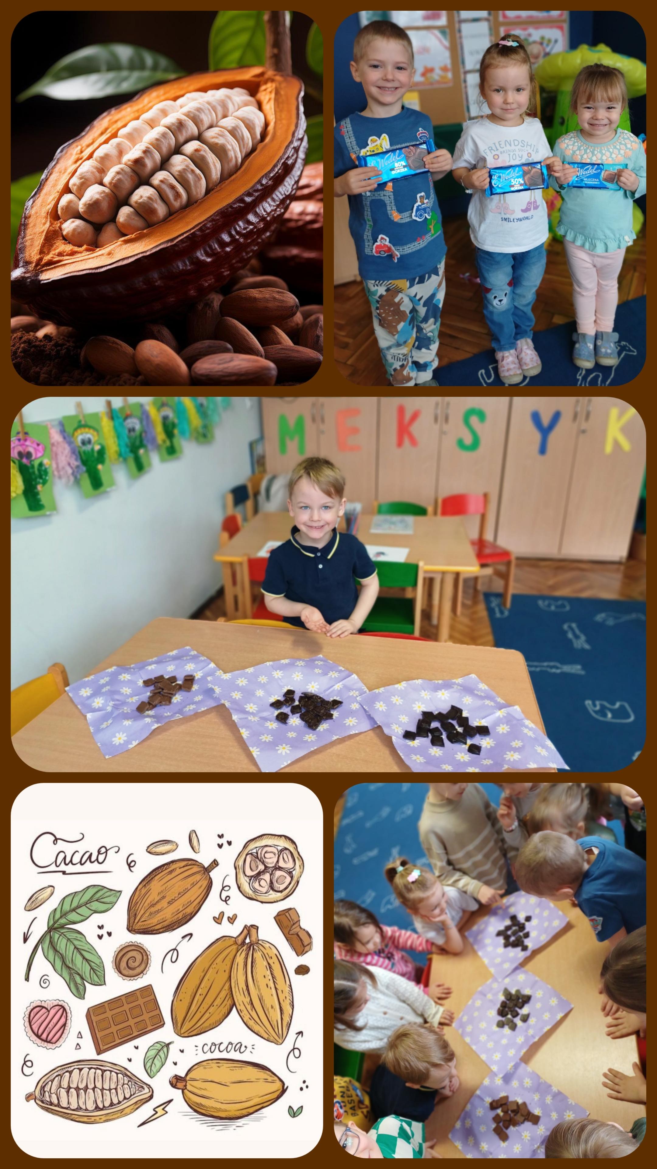 Węch i Smak (Czekoladowa Tradycja): Ann opowiedziała nam, że czekolada pochodzi właśnie z Meksyku. Dzieci wzięły udział w degustacji czekolady – od gorzkich smaków ziaren kakao, przez smak lekko gorzkiej czekolady, aż po ulubioną słodką, mleczną czekoladę.